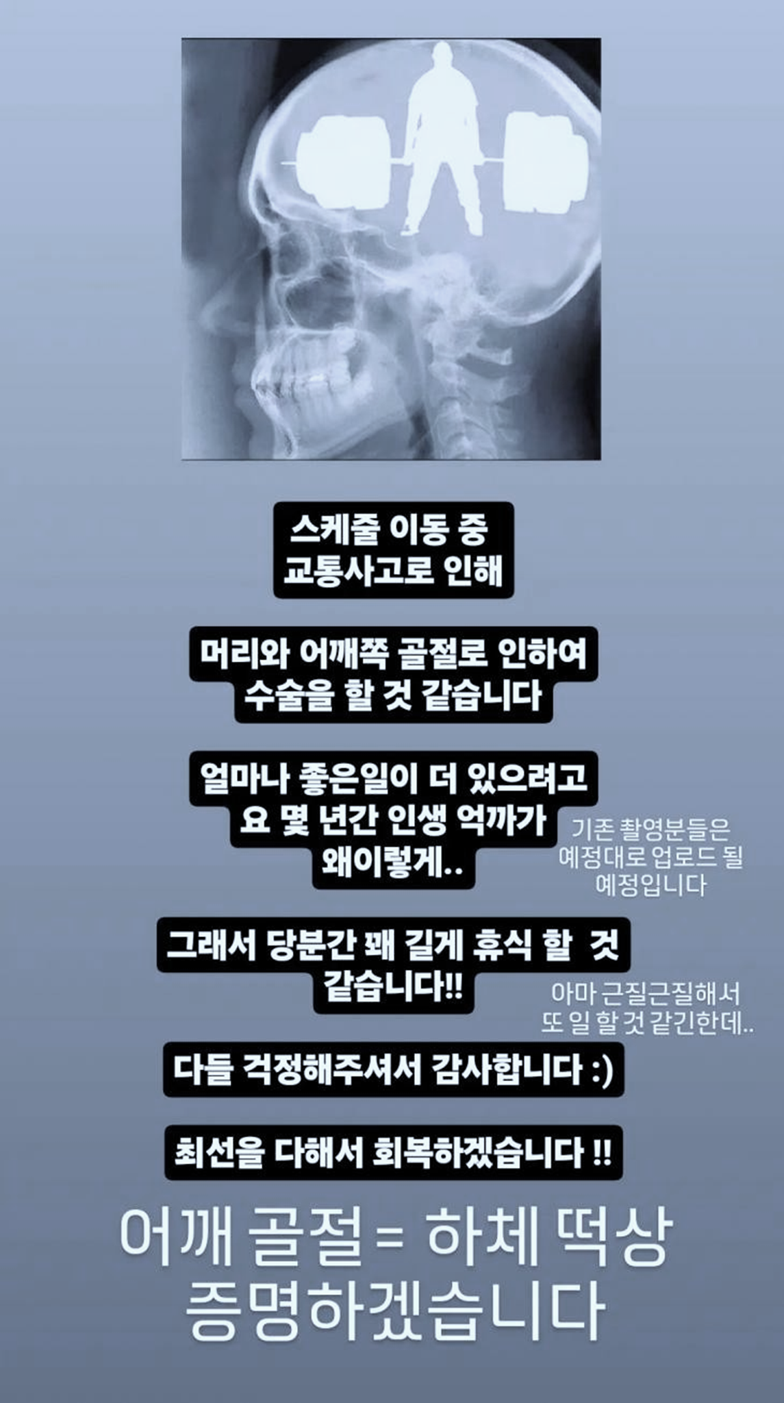 유튜버 및 방송인으로 활발하게 활동 중인 김계란은 6월 8일 개인 계정을 통해 "스케줄 이동 중 교통사고로 인해 머리와 어깨 쪽 골절로 인해 수술을 할 것 같다"라고 공지했습니다